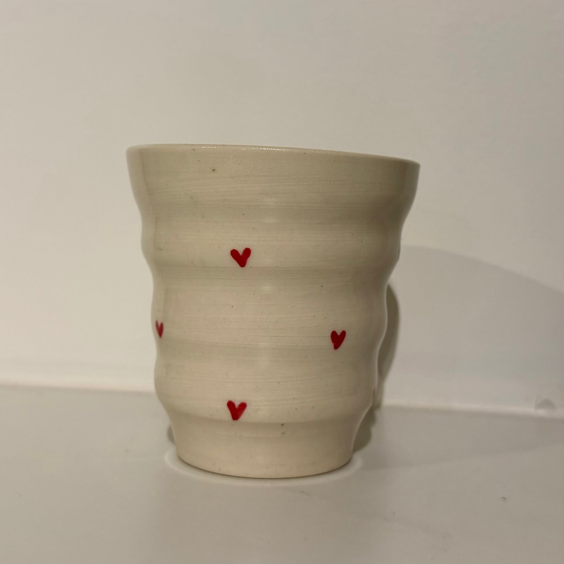 This handmade ceramic tumbler features a smooth, creamy finish paired with delicate hand-painted red hearts for a simple yet playful touch. Its clean, minimal look lets the soft shape and small details shine.